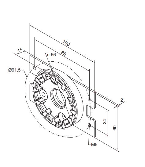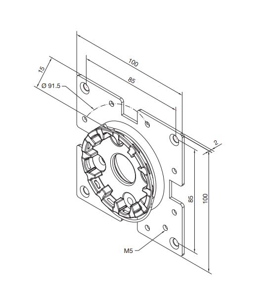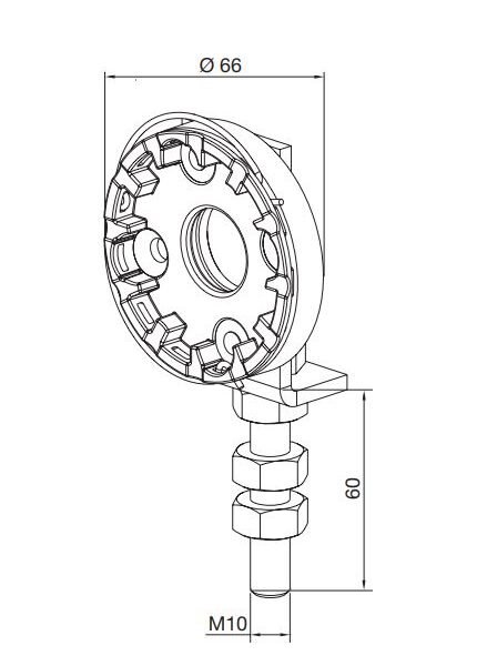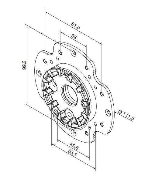 Supporto compatto in alluminio con molla e 2 fori M6 a interasse Ø 44mm, 2 fori M6 a interasse Ø 48mm, 2 sedi esagonali per dadi M6.