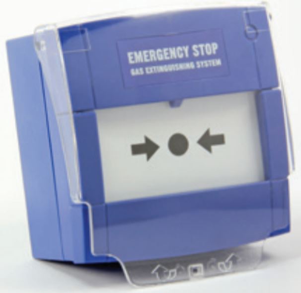 Inim – Pulsante manuale di alllarme per sistemi di spegnimento, colore BLU (STOP SCARICA). Certificazione EN12094-3. Uso interno.