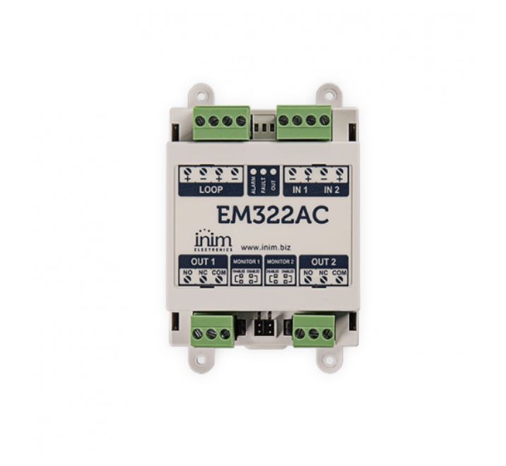 ULTERIORI CARATTERISTICHE: Il modulo EM322AC si collega al loop e dispone di due ingressi supervisionati (in grado di controllare lo stato di un dispositivo esterno) e di due relè in grado di pilotare carichi a tensione di rete 230 Vac.