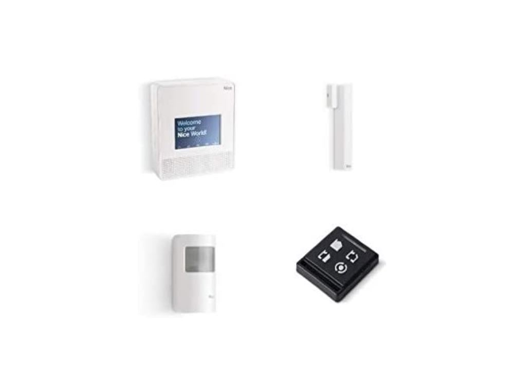 Kit allarme MyNice: centrale 99 zone in 6 aree, radio bidiriezionale Dual Band, Wi-Fi ed espansione filare, con touchscreen a colori 7″. Trasmettitore 4 canali, rivelatore magnetico e rivelatore volumetrico.