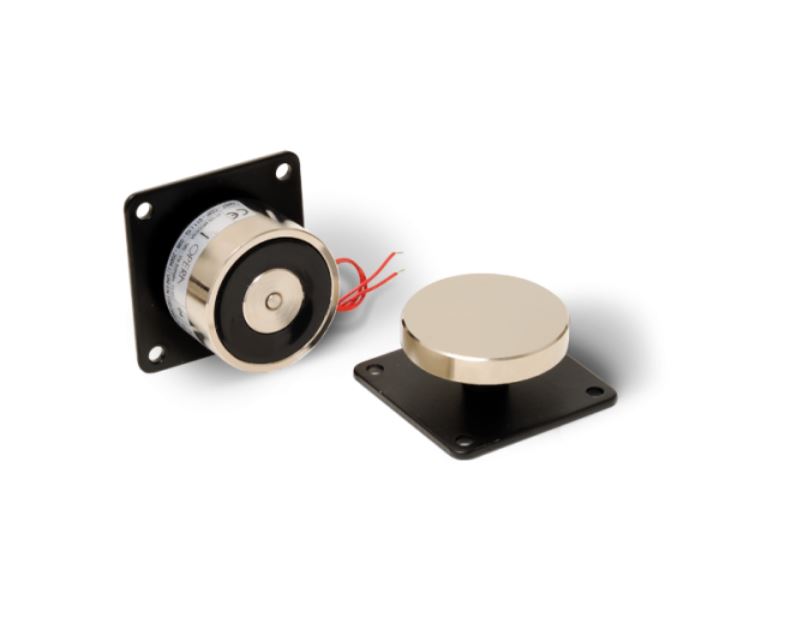 Inim – Elettromagneti di trattenuta per porte tagliafuoco con base di fissaggio, con base in acciaio zincato e contropiastra fissa con base in acciaio zincato.