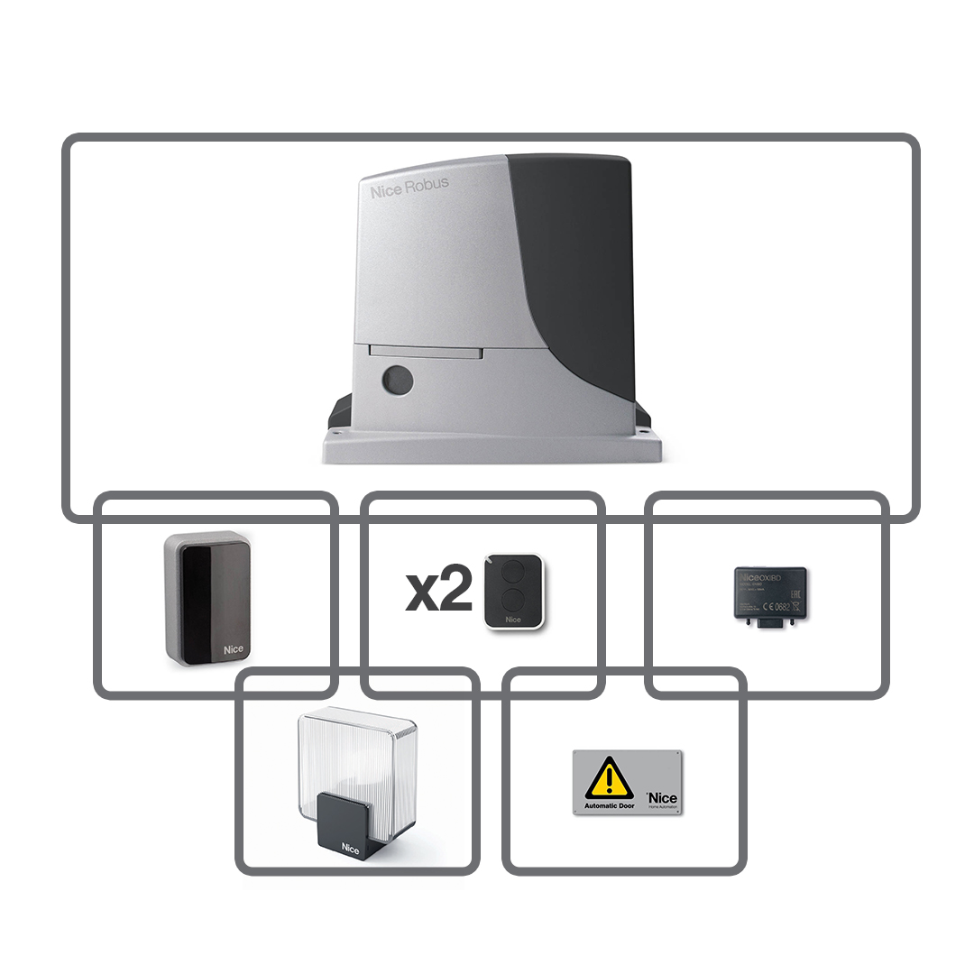 – 1 motoriduttore elettromeccanico irreversibile, con centrale incorporata e innesto per ricevitore della famiglia OXI/SM per il collegamento via Nice BlueBUS (cod. RB1000);